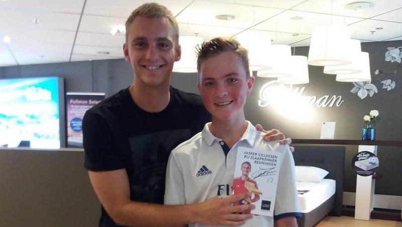 バルセロナのオランダ代表GKヤスパー・シレッセンは、出席したイベント会場で宿敵レアル・マドリードのユニフォームを着た少年から記念写真を頼まれる奇妙な場面に遭遇。この要望に快く応じたシレッセンだが、イベントで配られていたパンフレットでレアル・マドリードのエンブレムを隠すユーモアな一面を見せた。
