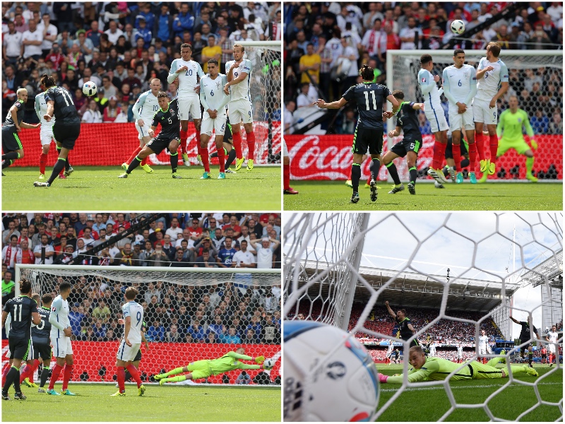 42分、影を潜めていたエースが沈黙を破り、ウェールズに先制点をもたらす。少し距離のある敵陣中央のFKで、ベイルが左足を振り抜き直接狙う。ブレ球の強烈なシュートは、反応したGKジョー・ハートの手も弾いてゴール右隅に吸い込まれた。前半はこのままウェールズの1点リードで折り返す。