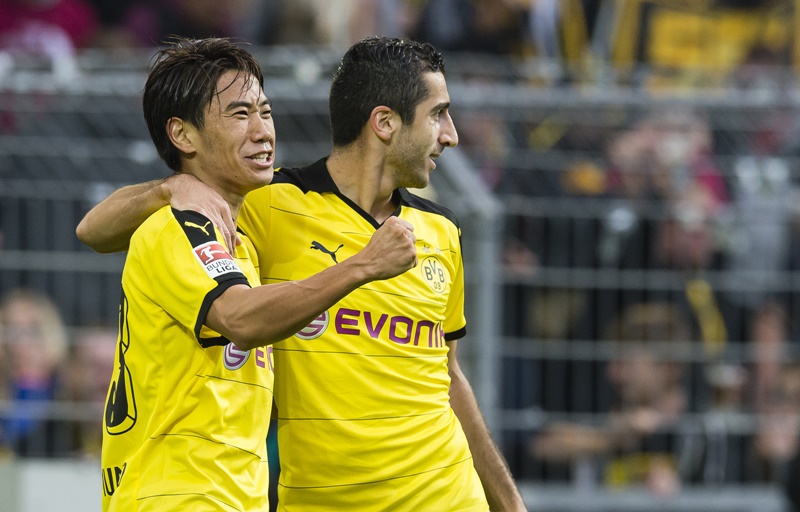 レヴァークーゼン戦で1ゴール1アシストを記録した香川(左) [写真]=Borussia Dortmund/Getty Images