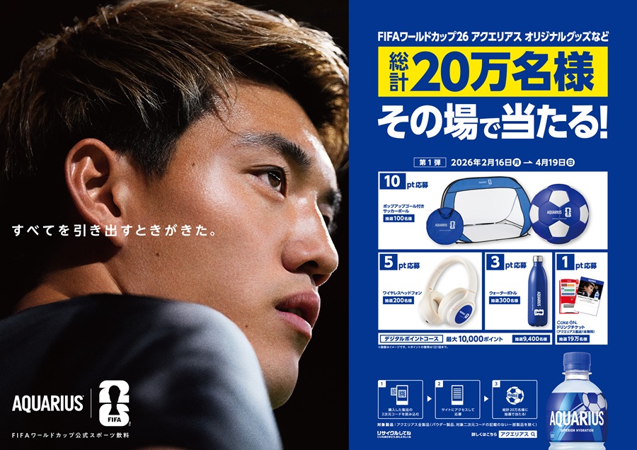 コカ・コーラシステムの「アクエリアス」は、FIFAワールドカップ26の公式スポーツ飲料として、FIFAワールドカップ26観戦ツアーが当たるキャンペーンを2月17日(火)より始動いたします。本キャンペーンではサッカー日本代表・堂安律選手がアンバサダーとなり、アクエリアス公式X上で展開される「#堂安律からの挑戦状」と題したミッションをクリアした方の中から5組10名様をFIFAワールドカップ26観戦チケット付きツアーにご招待します。これに併せて、堂安選手が登場する動画を公開し、2月21日(土)・22日(日)に渋谷道玄坂広場でキャンペーンを盛り上げるリアルイベントを開催します。また、期間限定の「アクエリアス」FIFAワールドカップ26デザインボトルの展開に合わせ、総計20万名様にその場で豪華賞品が当たるキャンペーンを全国で実施する等、同大会を盛り上げる様々な施策を実施します。