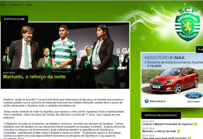FW田中順也が所属するスポルティング・リスボンは2日、2004年に発生したスマトラ島沖地震の津波から奇跡的に生き延びたインドネシア人のマルトゥニスが入団することをクラブ公式HP上で発表した。