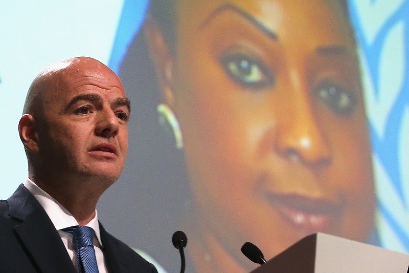 事務局長にサムラ氏を起用することを発表したFIFAのインファンティーノ会長 [写真]=FIFA via Getty Images