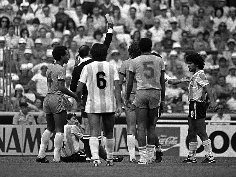 1982年W杯ブラジル戦で退場処分となったマラドーナ [写真]=Getty Images