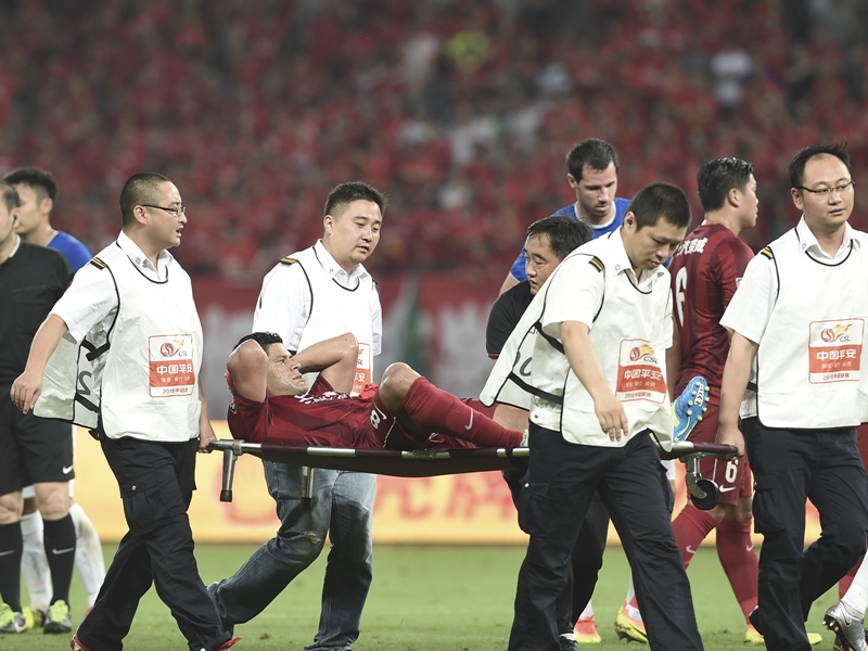 記念すべき中国での初ゴールは、右からのクロスに潰されながらも押し込んだ形だった。だが、フッキはその得点から5分も経たないうちに負傷してしまった。左ひざを痛めたフッキは、一度はピッチへ戻ったものの、その後プレー続行不可能に。結局、プレー時間わずか20分で無念の負傷交代となってしまった。
