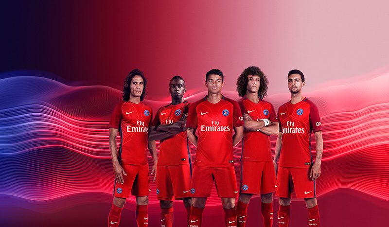 新アウェーユニフォームは、レッドを基調としながら、フランス国旗のトリコロールとクラブカラーにも含まれるブルーとホワイトの2つのカラーを巧みに融合。先進的なパフォーマンステクノロジーは、特に胸の部分を強調して表現されている。シャツの首後ろのリブには“Paris”の文字が、袖口内側の右側に“Grandeur”(壮麗)、左には“Passion”(情熱)の文字。これらのキーワードは、クラブが基本理念に掲げる言葉で、Grandeurにはブルー、Passion