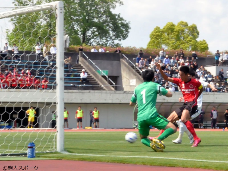 JR東日本カップ2016 第90回関東大学サッカーリーグ1部 第5節は23日、多摩市立陸上競技場で、駒澤大学が国士舘大学と対戦した。前半の立ちあがりからサイド攻撃を中心とした攻めで徐々にペースをつかんでいき、迎えた32分に右CKを大谷真史が豪快に頭で押し込み先制する。エンドが変わった後半は逆に相手に攻め込まれる展開が続いたが、51分に金大生がミドルシュートを決め2点のリードを奪う。その後、相手の直接FKで失点したものの、82分にまたも大谷がダメ押しとなる3点目を決め勝負あり。3-1で2試合ぶりの勝利を手にした。