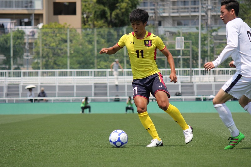今節も日差しが強い中で試合は始まった。試合開始すぐに松木駿之介が遠目からシュートするも、その後は10分まで防戦一方となった。3分、DFのクリアミスから相手にGKとの一対一を作られるもGK上田朝都がファインセーブ。その後もDFのミスから立て続けにシュートを打たれるも何とか防いだ。10分過ぎになってようやく慶應大が相手陣地に押し込むようになる。14分に溝渕のクロスから惜しいシーンを作るも相手に防がれる。一進一退の状態が続く中、26分に相手のサイドハーフにサイドから切り込まれそのまま失点を許してしまう。その後すぐに反撃に出る。31分に右からのクロスに松木がダイビングヘッドで合わせるも及ばず。38分、43分にもセットプレーからチャンスを作るもこれを決めきれない。やや空回りの状態で前半は終了する。