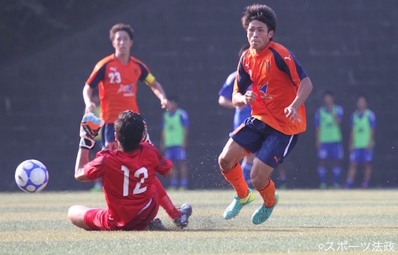 後半は、法政大の安定した守備で相手にチャンスを作らせず、ボールを支配しいくつかチャンスを作った。50分、清谷陸が右サイドを突破し、フリーの山田にクロス。これを山田が合わせるも、惜しくも枠の上。52分には清谷がスルーパスから抜け出し、飛び出してきたGK長谷川洸に倒される。決定機阻止のようにも見えたが、主審の判定はイエローカード。後半中盤はボールポゼッションを高めるも相手の集中した守備の前にチャンスを作れない展開が続いたが、終盤に立て続けにチャンスを作った。88分にスローインからボールを受けた黒柳駿がシュート。しかし、相手ディフェンスの体を張った守備に阻まれる。89分には再び黒柳がシュートを放ったが、これも得点には至らず。最後まで1点が遠く完封負けを喫した。