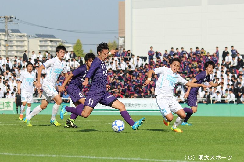 有終の美は飾れなかったものの接戦を演じた。4年生にとってリーグ戦ラストゲームとなった今試合には4年生8名が先発出場。「トレーニングの中で先週も水町(政哉)は非常によくて、伊池(翼)もずっとトレーニングではよかった」(栗田大輔監督)と伊池、水町を実力から起用。優勝決定から3戦勝ちがなかったこともあり、「勝ちにこだわってやってきた」(小出悠太)今試合。4年生の気迫とボールへの執着を見せ、慎重にシュートチャンスをうかがった。そして34分、土居柊太が落としたボールを「あとは振り抜くだけだった」と岩田がゴールに突き刺した。後半は相手の時間が続き失点を喫するも、球際での粘り強さを感じさせるディフェンスと服部の好セーブにより追加点は許さず。「1位と2位の対決だなという感じだった」(栗田監督)。最終節を勝利で飾れなかった悔しさは残るが収穫も多かった。