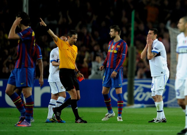 【2009-10シーズンのCL準決勝バルセロナ対インテル。ブスケが顔を叩かれたと主張し倒れ込む。しかし審判が退場を宣告する瞬間を手の隙間から冷静にのぞいていた】