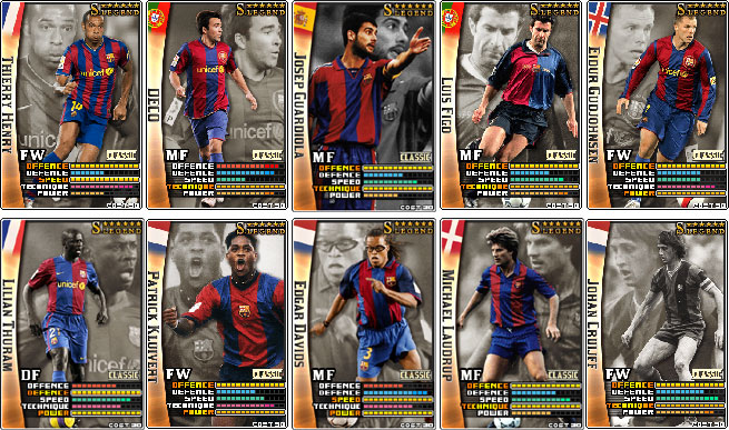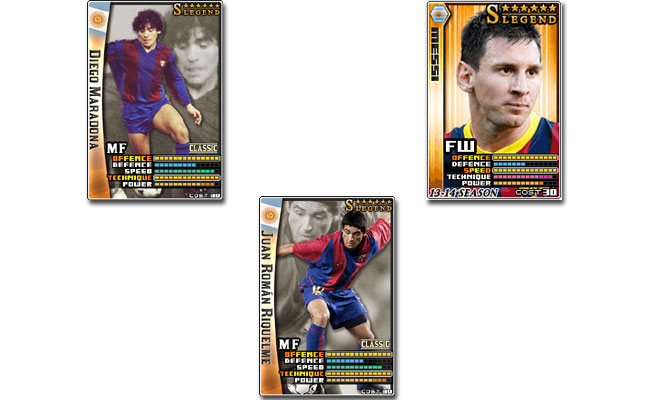 紹介した選手カード以外にも、アンリやデコ、グアルディオラ、フィーゴ、グジョンセン、テュラム、クライファート、ダーヴィッツ、ラウドルップ、さらにはクライフが選手カードとして登場。FCバルセロナのレジェンドを加えて、最強チームを目指そう!!