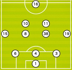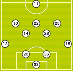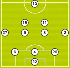 MF 2.扇原 貴宏/6.山口 蛍/13.南野 拓実/5.長谷川 アーリアジャスール