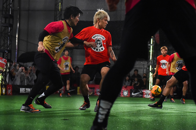 ナイキの「リスク上等」キャンペーンの一環として、GKなしの4対4という変則マッチが組まれた今大会。決勝ラウンドには、各予選会場を勝ち抜いた代表12チーム及び、各会場の代表チームを除いた全チームの中の最多勝利チーム、「NIKE FC」選抜チーム、特別招待2チームの計16チームが集結。東京最強チームの称号を懸けて激戦を繰り広げた。