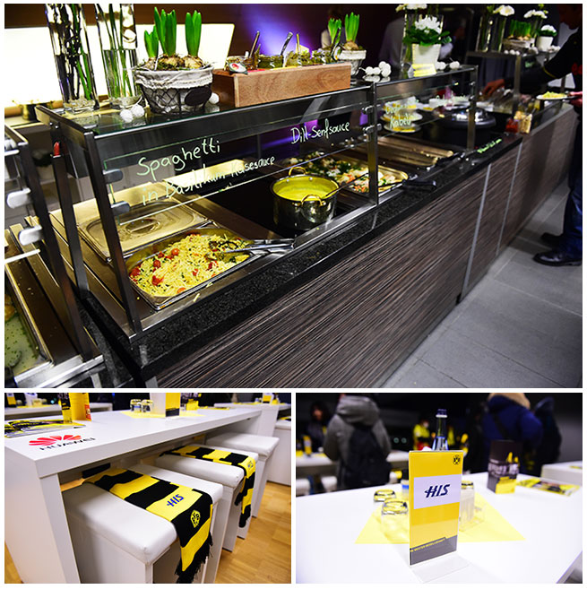 試合開始まで90分を切ったところで一行は再びスタジアムへ戻り、2階席へ上がってVIPラウンジへ。試合のチケットと食事代がセットになったこのスポンサーラウンジのチケットはVIPやスポンサー関係者の他に一般のファンも購入可能だが、人気が高く入手は困難。スタジアムツアーに同行したスタッフによると、このラウンジに日本人が入るのは非常に珍しいことだそうだ。この日はドイツサッカーリーグ(DSL)の会長など著名人の姿もちらほらと見かけた。