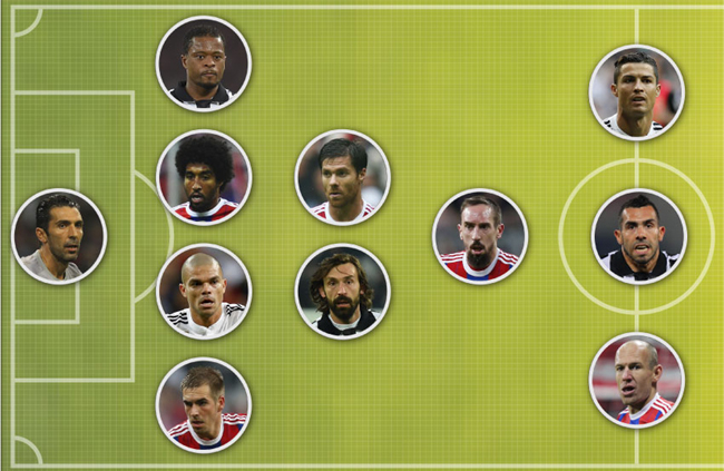 MF:フランク・リベリー(バイエルン)、シャビ・アロンソ(バイエルン)、アンドレア・ピルロ(ユヴェントス)