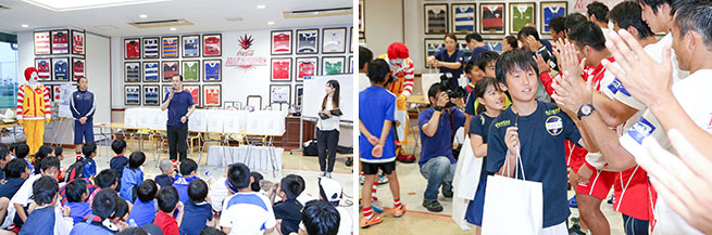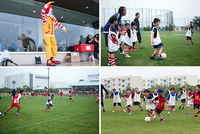 ドナルド・マクドナルドのリードでドナルド体操を行い、ウォーミングアップ。サッカーの指導はアビスパ福岡のスクールコーチが務め、基本的なサッカーの動きや手つなぎサッカーを行った。一方のラグビー指導は、コカ・コーラレッドスパークスの監督・選手たちがリード。ほとんどの参加者がラグビー初体験というなか、ボディコンタクトやトライ、ラインアウト、ゴールキックなどを楽しんだ。